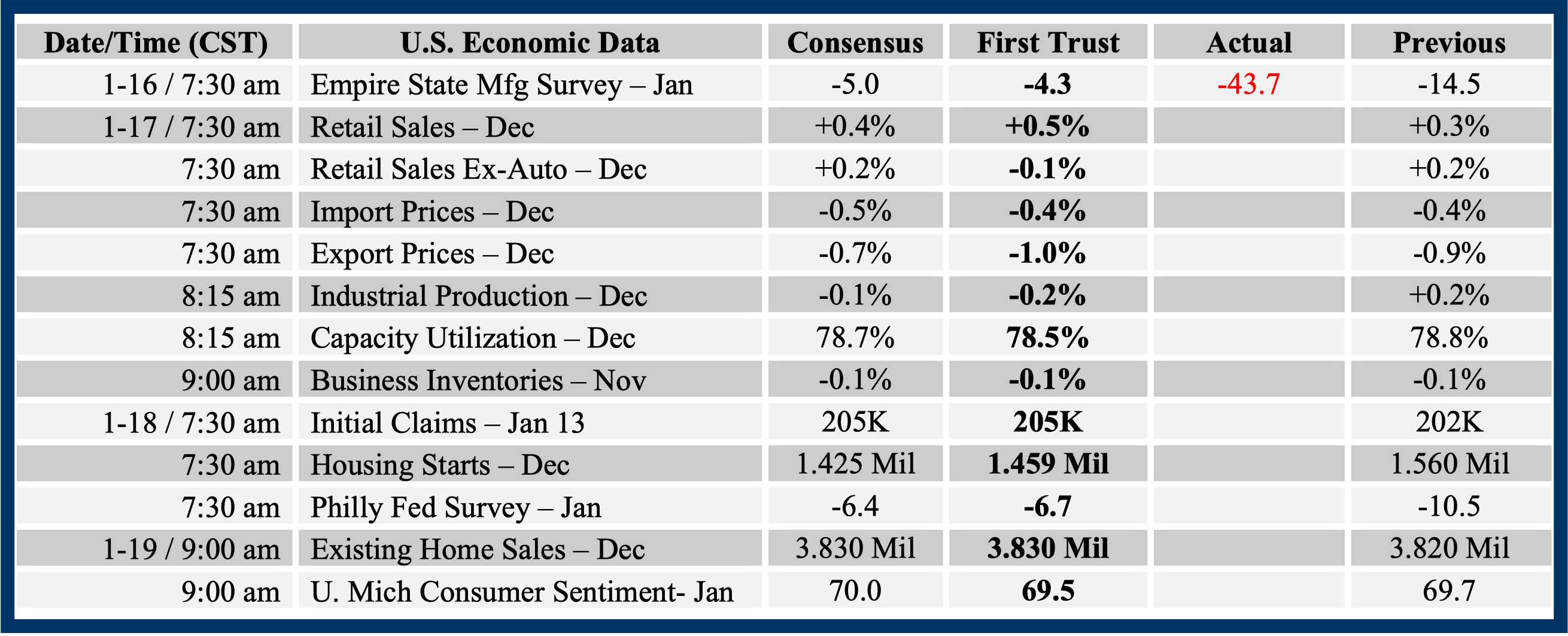 Consensus forecasts come from Bloomberg. This report was prepared by First Trust Advisors L. P., and reflects the current opinion of the authors. It is based upon sources and data believed to be accurate and reliable. Opinions and forward looking statements expressed are subject to change without notice. This information does not constitute a solicitation or an offer to buy or sell any security.