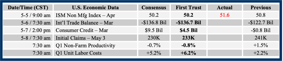 Consensus forecasts come from Bloomberg. This report was prepared by First Trust Advisors L. P., and reflects the current opinion of the authors. It is based upon sources and data believed to be accurate and reliable. Opinions and forward looking statements expressed are subject to change without notice. This information does not constitute a solicitation or an offer to buy or sell any security.