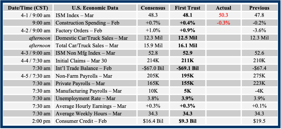 Consensus forecasts come from Bloomberg. This report was prepared by First Trust Advisors L. P., and reflects the current opinion of the authors. It is based upon sources and data believed to be accurate and reliable. Opinions and forward looking statements expressed are subject to change without notice. This information does not constitute a solicitation or an offer to buy or sell any security.