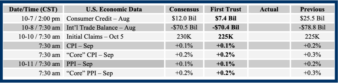 Consensus forecasts come from Bloomberg. This report was prepared by First Trust Advisors L. P., and reflects the current opinion of the authors. It is based upon sources and data believed to be accurate and reliable. Opinions and forward looking statements expressed are subject to change without notice. This information does not constitute a solicitation or an offer to buy or sell any security.